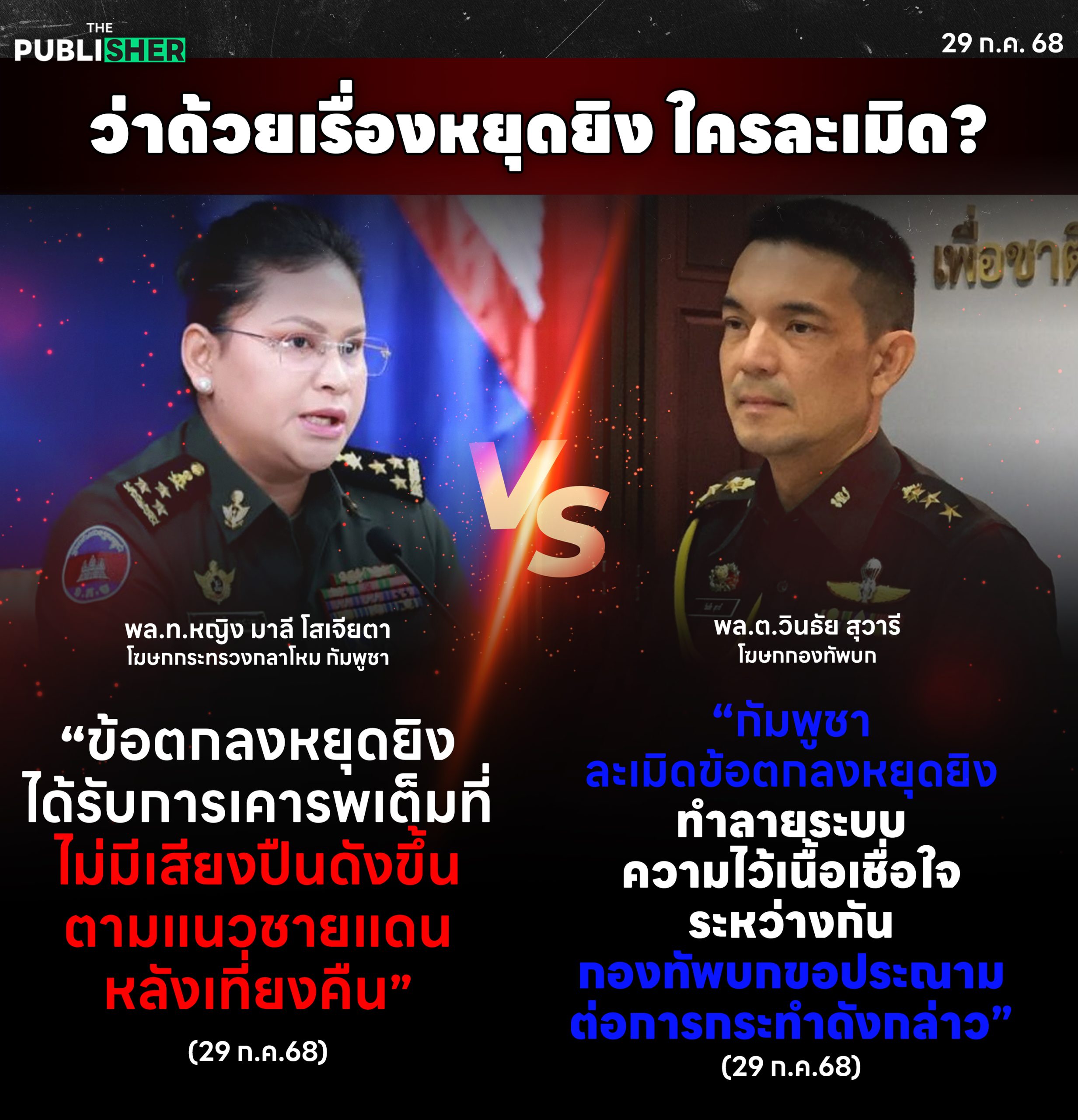 #ThePublisherTH#สำนักข่าวออนไลน์เพื่อสังคม#กัมพูชายิงก่อน#ไทยนี้รักสงบแต่ถึงรบไม่ขลาด#CambodiaOpenedFire#ทหารมีไว้ปกป้องอธิปไตย#TruthFromThailand#ละเมิดหยุดยิง#เจรจาหยุดยิง#กองทัพบก#อาชญากรสงคราม