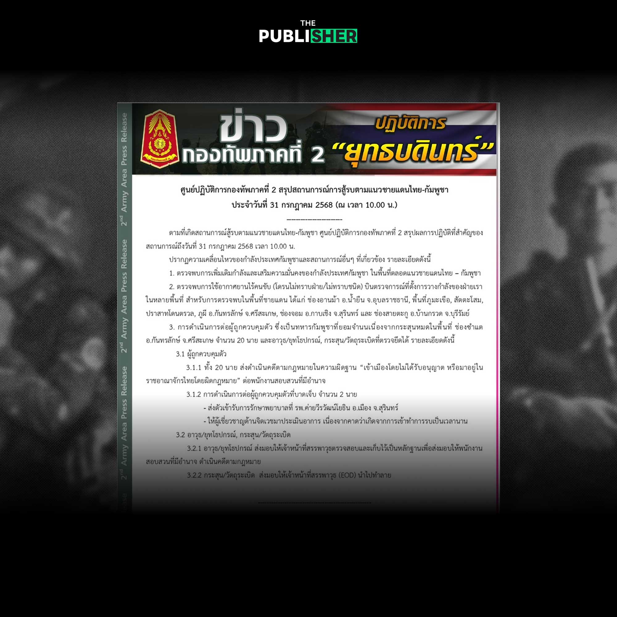 #ThePublisherTH#สำนักข่าวออนไลน์เพื่อสังคม#กัมพูชายิงก่อน#ไทยนี้รักสงบแต่ถึงรบไม่ขลาด#CambodiaOpenedFire#ทหารมีไว้ปกป้องอธิปไตย#TruthFromThailand#ละเมิดหยุดยิง#อาชญากรสงคราม#ประณามกัมพูชา#กองทัพภาคที่2#ยุทธบดินทร์