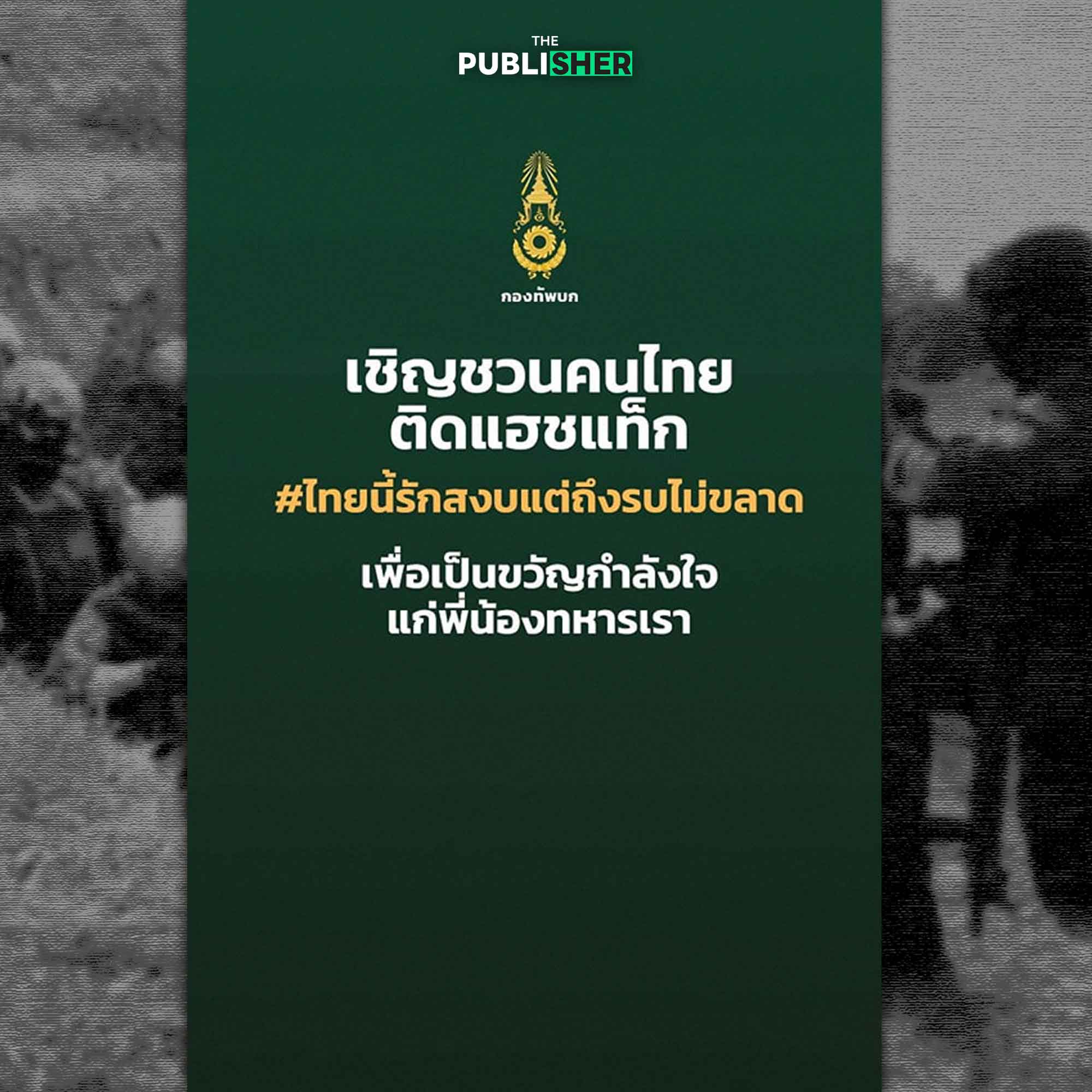 ทั้งนี้ข้อความระบุว่า เชิญช่วนพี่น้องไทย ติด #ไทยนี้รักสงบแต่ถึงรบไม่ขลาด