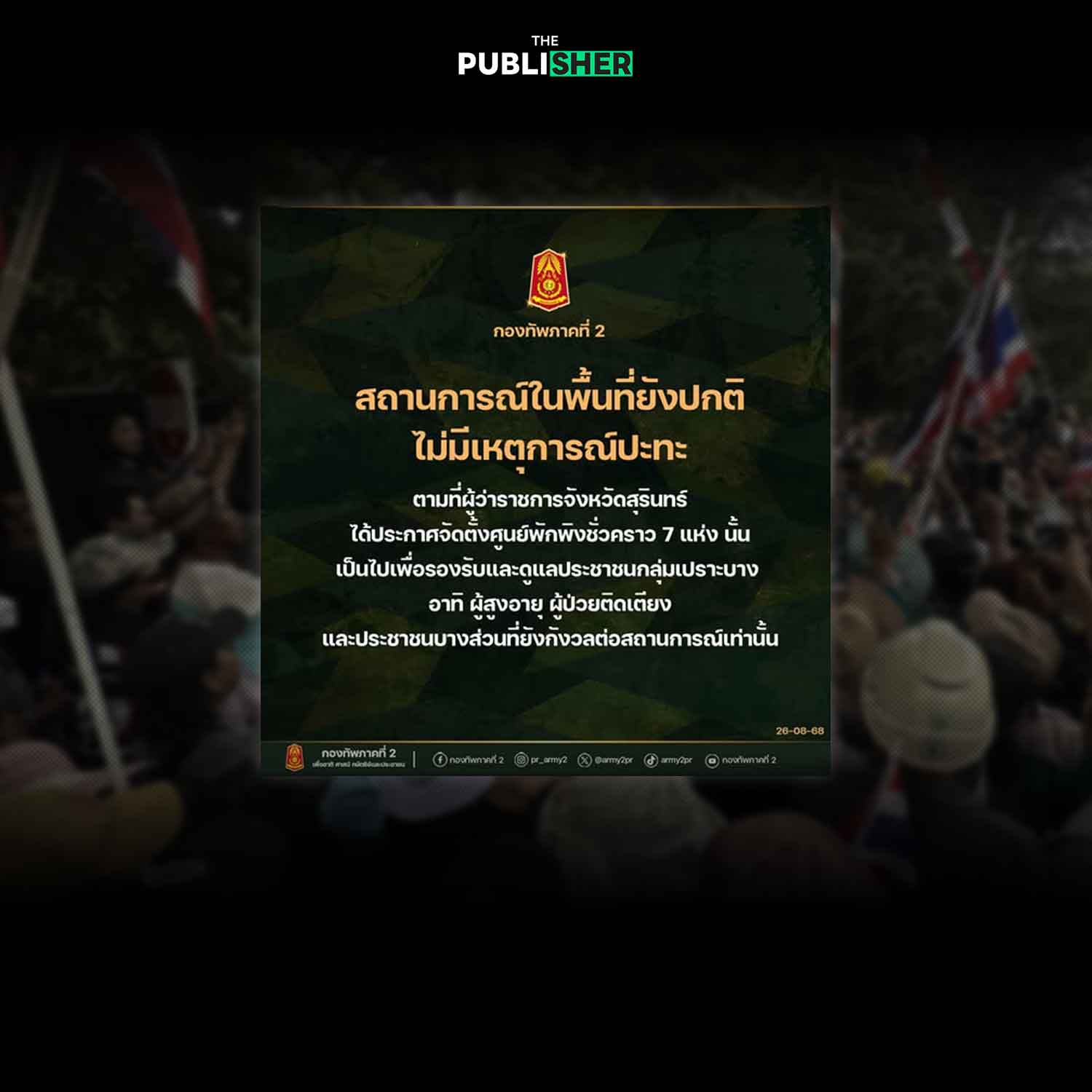เรื่องนี้กองทัพภาคที่ 2 ตรวจสอบข้อเท็จจริงกับส่วนราชการที่เกี่ยวข้องในพื้นที่แล้ว พบว่า การเปิดศูนย์พักพิงชั่วคราวดังกล่าว มีวัตถุประสงค์เพื่อรองรับและดูแลประชาชนในกลุ่มเปราะบาง อาทิ ผู้สูงอายุ ผู้ป่วยติดเตียง และประชาชนบางส่วนที่ยังมีความกังวลต่อสถานการณ์ โดยขณะนี้มีประชาชนจากอำเภอกาบเชิง อพยพเข้ามาในพื้นที่อำเภอเมืองสุรินทร์ ประมาณ 200 คน