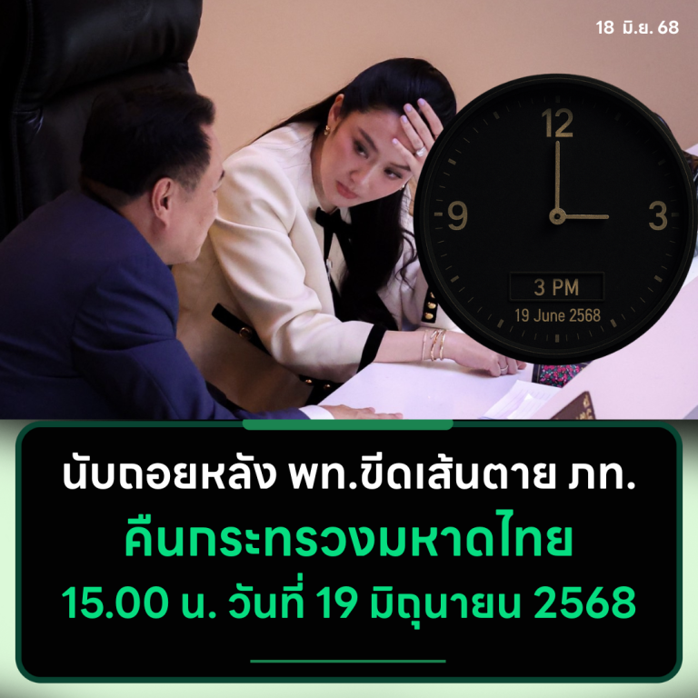 เป็นเส้นตายที่พรรคเพื่อไทย โดยนางสาวแพทองธาร ชินวัตร นายกรัฐมนตรี และหัวหน้าพรรคเพื่อไทย ที่ตัดสินใจเดินหน้าปรับคณะรัฐมนตรี โดยขอกระทรวงมหาดไทยคืนจากภูมิใจไทย ที่ได้แจ้งนายอนุทิน ชาญวีรกูล รองนายกฯ และรัฐมนตรีว่าการกระทรวงมหาดไทย ในฐานะหัวหน้าพรรคภูมิใจไทย ว่าขอ ขอกระทรวงมหาดไทยกลับมาบริหารเอง แลกกับให้ไปบริหารกระทรวงสาธารณสุข และเก้าอี้รัฐมนตรีเพิ่มอีก 1 ตำแหน่ง โดยขอคำตอบภายใน 48 ชั่วโมง หรือถึงเวลา 15.00 น. วันที่ 19 มิ.ย.นี้ ไม่เช่นนั้น นายกฯ จะต้องปรับ ครม. โดยไม่มีพรรคภูมิใจไทยร่วมรัฐบาล