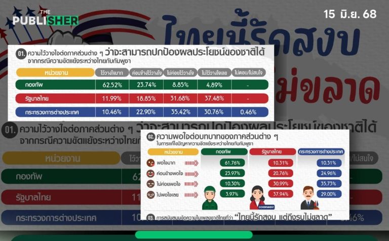 เป็นผลสำรวจจากศูนย์สำรวจความคิดเห็น “นิด้าโพล” เรื่อง “ไทยนี้รักสงบ แต่ถึงรบไม่ขลาด” จำนวนทั้งสิ้น 1,310 หน่วยตัวอย่าง เกี่ยวกับความไว้วางใจและความพอใจต่อบทบาทของภาคส่วนต่าง ๆ ในการแก้ไขปัญหาความขัดแย้งระหว่างไทยกับกัมพูชา โดยถามถึงความไว้วางใจต่อภาคส่วนต่าง ๆ ว่าจะปกป้องผลประโยชน์ของชาติได้ ซึ่งพบว่าอันดับ 1 คือกองทัพ ที่ร้อยละ 62.52 ระบุไว้วางใจมาก รองลงมา ร้อยละ 23.74 ระบุค่อนข้างไว้วางใจ ส่วนรัฐบาลนั้นร้อยละ 37.48 ระบุไม่ไว้วางใจเลย รองลงมา ร้อยละ 31.68 ระบุไม่ค่อยไว้วางใจ รวมถึงกระทรวงการต่างประเทศ ร้อยละ 35.42 และ 30.76 ไม่ค่อยไว้วางใจ และไม่ไว้วางใจเลยตามลำดับ