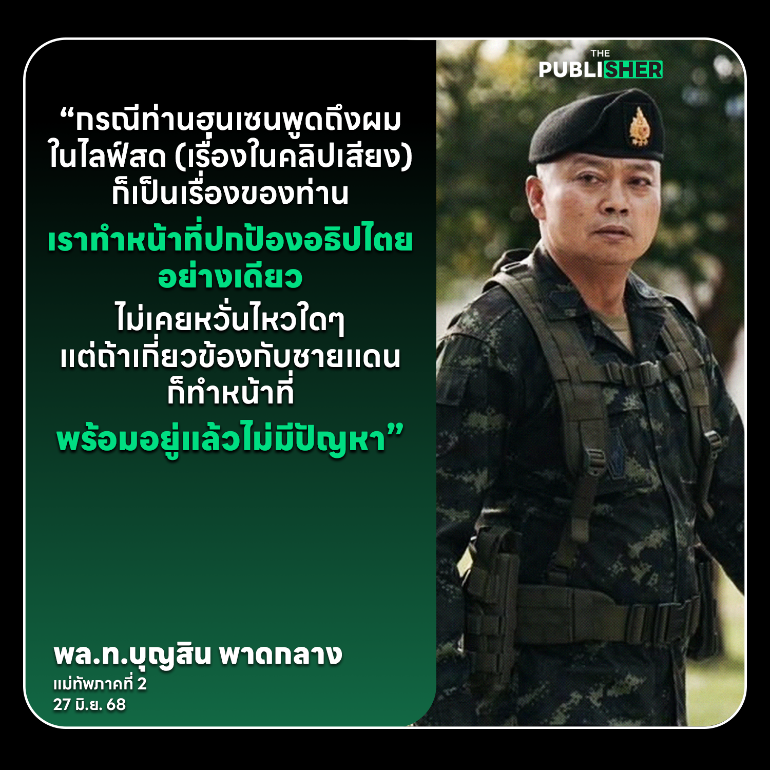 “กรณีท่านฮุนเซนพูดถึงผมในไลฟ์สด (เรื่องในคลิปเสียง) ก็เป็นเรื่องของท่าน เราทำหน้าที่ปกป้องอธิปไตยอย่างเดียว ไม่เคยหวั่นไหวใดๆ แต่ถ้าเกี่ยวข้องกับชายแดนก็ทำหน้าที่ พร้อมอยู่แล้วไม่มีปัญหา…”
