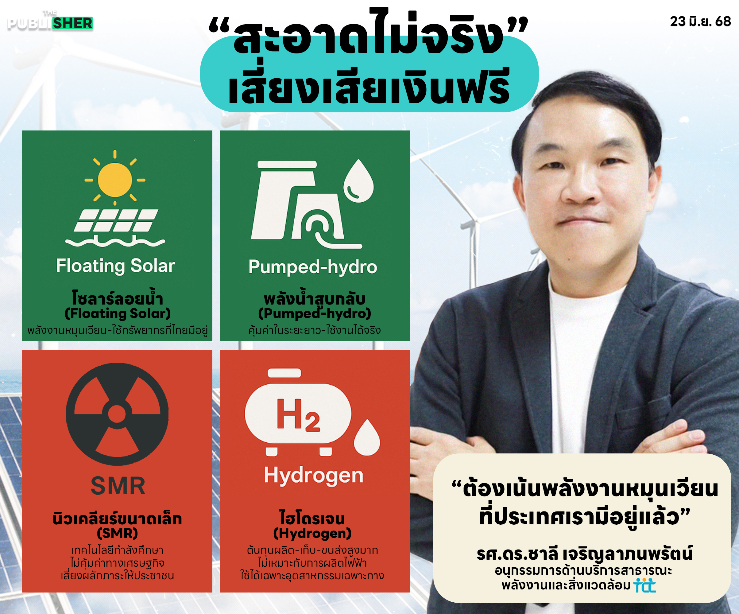 “ถ้าเป้าหมายคือพลังงานสะอาด ราคาถูก และลดความเสี่ยงให้ประชาชน… ต้องเน้นพลังงานหมุนเวียนที่ประเทศเรามีอยู่แล้ว เช่น แสงแดด–ลม–ชีวมวล ร่วมกับระบบกักเก็บ ไม่ใช่เบี่ยงไปลงทุนเทคโนโลยีเสี่ยงหรือย้อนยุค”#ThePublisherTH#สำนักข่าวออนไลน์เพื่อสังคม#ต้นทุนพลังงาน#BloombergNEF#รัฐบาลแพทองธาร#ค่าไฟแพง#โซลาร์เซลล์#พลังน้ำสูบกลับ#นิวเคลียร์ขนาดเล็ก#ไฮโดรเจน#ชาลีเจริญลาภนพรัตน์