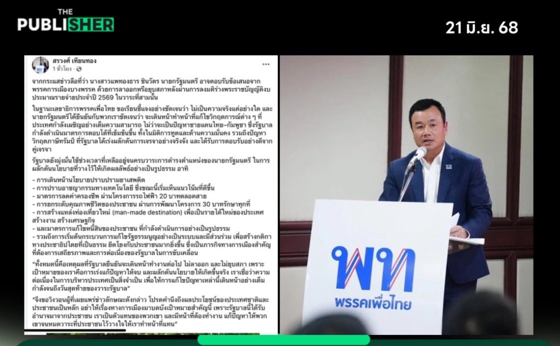 สรวงศ์ เทียนทอง รัฐมนตรีว่าการกระทรวงการท่องเที่ยวและกีฬา ในฐานะเลขาธิการพรรคเพื่อไทย โพสต์เฟซบุ๊กชี้แจงกรณีกระแสข่าวลือที่ระบุว่า นางสาวแพทองธาร ชินวัตร นายกรัฐมนตรี อาจพิจารณายุบสภาหรือลาออกหลังการผ่านร่าง พ.ร.บ.งบประมาณ ปี 2569 วาระสาม โดยยืนยันว่า “ไม่เป็นความจริงแต่อย่างใด”
