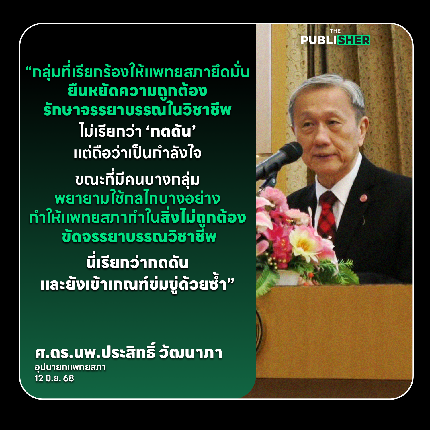 “กลุ่มที่เรียกร้องให้แพทยสภายึดมั่น ยืนหยัดความถูกต้อง รักษาจรรยาบรรณในวิชาชีพ ไม่เรียกว่า “กดดัน” แต่ถือว่าเป็นกำลังใจ ขณะที่มีคนบางกลุ่มพยายามใช้กลไกบางอย่าง ทำให้แพทยสภาทำในสิ่งไม่ถูกต้อง ขัดจรรยาบรรณวิชาชีพ นี่เรียกว่ากดดัน และยังเข้าเกณฑ์ข่มขู่ด้วยซ้ำ”