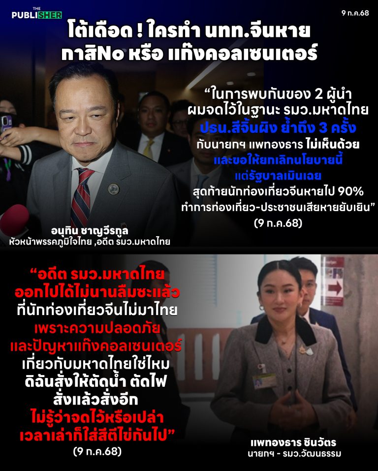 “ในการพบกันของ 2 ผู้นำ ผมจดไว้ในฐานะ รมว.มหาดไทย ปธน.สีจิ้นผิง ย้ำถึง 3 ครั้งกับนายกฯ แพทองธาร ไม่เห็นด้วย และขอให้ยกเลิกนโยบายนี้ แต่รัฐบาลเมินเฉย สุดท้ายนักท่องเที่ยวจีนหายไป 90% ทำการท่องเที่ยว-ประชาชนเสียหายยับเยิน “