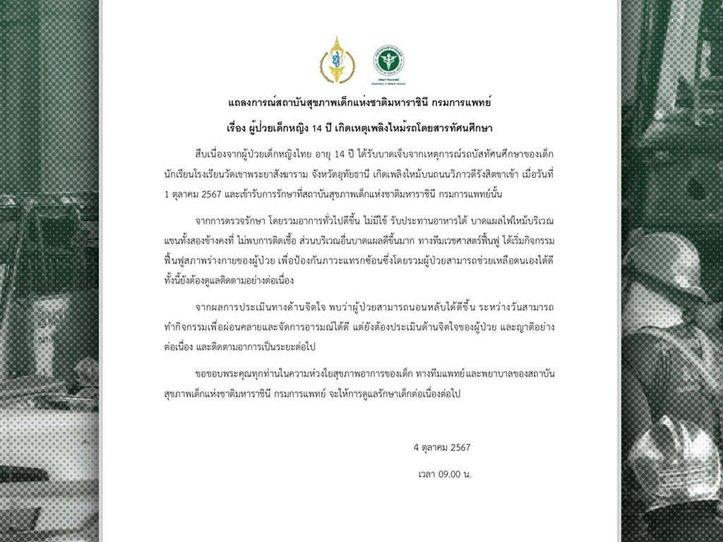 สถาบันสุขภาพเด็กแห่งชาติมหาราชินี กรมการแพทย์ ออกแถลงการณ์เรื่อง ผู้ป่วยเด็กหญิง 14 ปี ซึ่งได้รับบาดเจ็บจากเกิดเหตุเพลิงไหม้รถโดยสารทัศนศึกษา