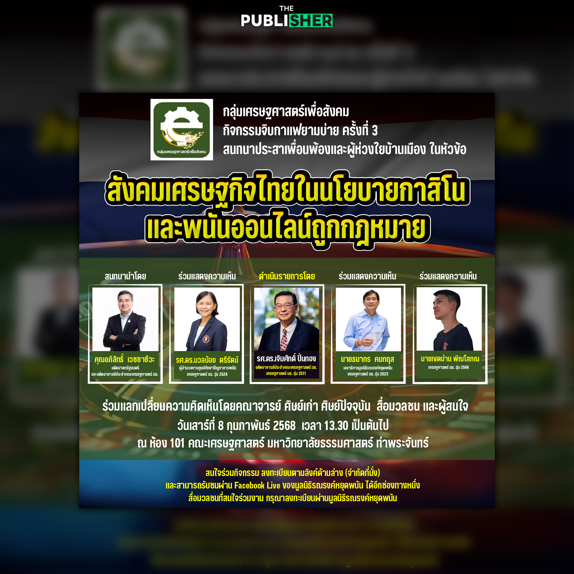 เวทีนี้จะมีขึ้นในวันที่ 8 กุมภาพันธ์ 2568 เวลา 13.30 น. ที่ห้อง 101 คณะเศรษฐศาสตร์ มหาวิทยาลัยธรรมศาสตร์ ท่าพระจันทร์ ซึ่งต้องบอกว่าห้องประชุมนี้รับผู้ชมจำนวนจำกัด ต้องเปิดให้ลงทะเบียนผ่านมูลนิธิรณรงค์หยุดพนัน หรือรับชมผ่าน Facebook Live ของมูลนิธิรณรงค์หยุดพนัน