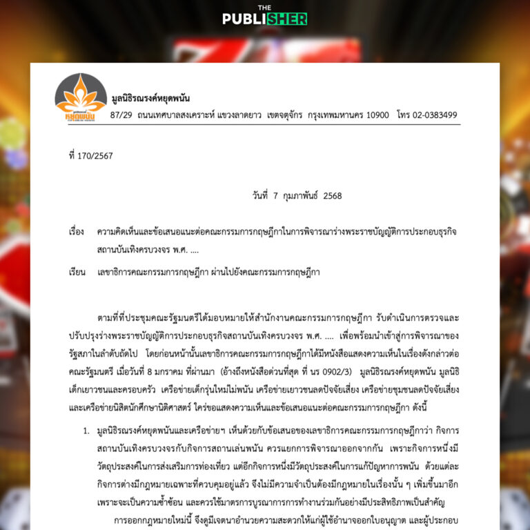 กลุ่มองค์กรภาคประชาชน ซึ่งประกอบด้วย มูลนิธิรณรงค์หยุดพนัน มูลนิธิเด็กเยาวชนและครอบครัว เครือข่ายเด็กรุ่นใหม่ไม่พนัน เครือข่ายเยาวชนลดปัจจัยเสี่ยง เครือข่ายชุมชนลดปัจจัยเสี่ยง และเครือข่ายนิสิตนักศึกษานิติศาสตร์ ได้ยื่นหนังสือถึงคณะกรรมการกฤษฎีกา ผ่านไปยังเลขาธิการคณะกรรมการกฤษฎีกา เพื่อแสดงความคิดเห็นและข้อเสนอแนะต่อร่างพระราชบัญญัติการประกอบธุรกิจสถานบันเทิงครบวงจร พ.ศ. ….