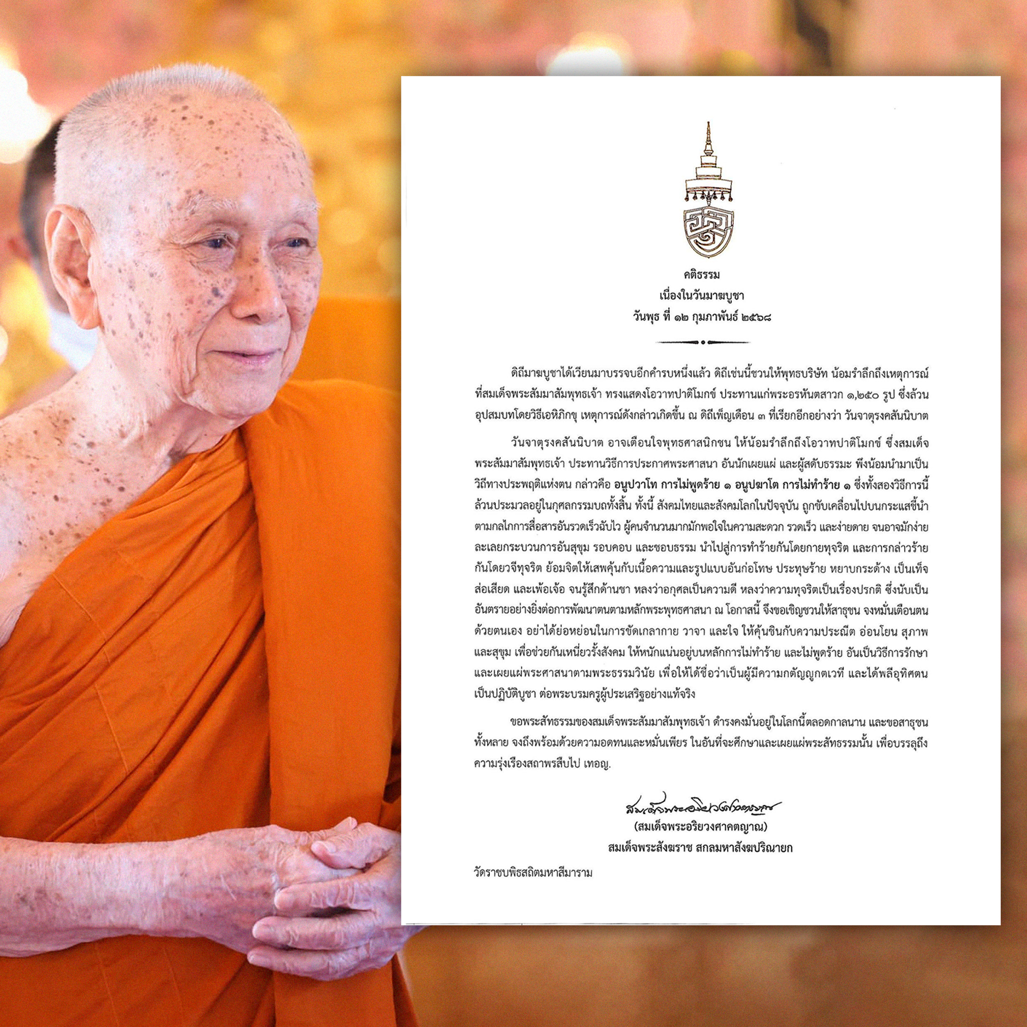 เพจ สำนักงานเลขานุการสมเด็จพระสังฆราช โพสต์ข้อความผ่านเฟซบุ๊ก เนื่องในวันมาฆบูชา 12 กุมภาพันธ์ 2568 เจ้าพระคุณ สมเด็จพระอริยวงศาคตญาณ สมเด็จพระสังฆราช สกลมหาสังฆปริณายก ประทานพระคติธรรม ความว่า