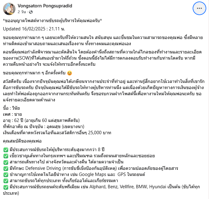 กลายเป็นไวรัลที่มียอดกดไลก์กว่า 90,000 ครั้ง หลังผู้ใช้ Facebook รายหนึ่งซึ่งเป็นลูกชาย ได้มาโพสต์หางานขับรถผู้บริหารให้คุณพ่อในวัย 62 ปี ในกลุ่ม ‘กลุ่มคนขับรถผู้บริหาร’ โดยแนบประวัติ คุณสมบัติ ทักษะ ประสบการณ์การทำงาน เงินเดือนที่คาดหวัง พร้อมการันตีมาตรฐานความปลอดภัยในการขับขี่ได้อย่างครบถ้วนไม่มีตกหล่น จนชาวเน็ตหลายคนต่างก็เข้ามาร่วมแสดงความคิดเห็นชื่นชมการเขียนโพสต์ของผู้เป็นลูกชาย ที่ระบุรายละเอียดทุกอย่าง และเขียนประวัติโดยย่อของผู้หางานในตำแหน่งที่ต้องการได้อย่างมีคุณภาพ พร้อมทั้งอวยพรให้คุณพ่อเจ้าของโพสต์ได้งานโดยเร็ว