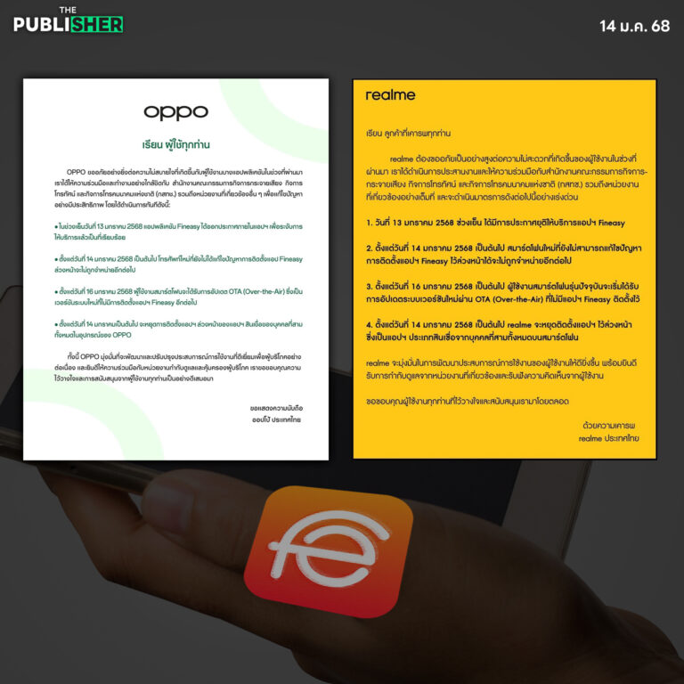 ◾ 16 มกราคม 2568: ผู้ใช้สมาร์ทโฟน OPPO จะได้รับการอัปเดตซอฟต์แวร์ (OTA) เพื่อลบแอปฯ Fineasy ออกจากอุปกรณ์