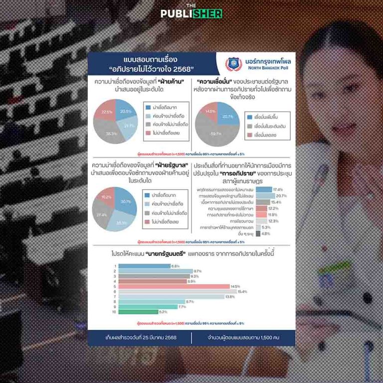 ผศ.ดร.สานิต ศิริวิศิษฐ์กุล หัวหน้าศูนย์สำรวจความคิดเห็น นอร์ทกรุงเทพโพล มหาวิทยาลัยนอร์ทกรุงเทพ เปิดเผยผลสำรวจความคิดเห็นประชาชนทั่วประเทศ จำนวน 1,500 คน ในช่วงวันที่ 24–25 มีนาคม 2568 ภายหลังการอภิปรายไม่ไว้วางใจนายกรัฐมนตรี น.ส.แพทองธาร ชินวัตร พบว่า ประชาชนส่วนใหญ่มองว่า นายกรัฐมนตรีสามารถผ่านศึกอภิปรายครั้งนี้ไปได้ และยังคงรักษาระดับ “ความเชื่อมั่น” ได้ในระดับเดิม