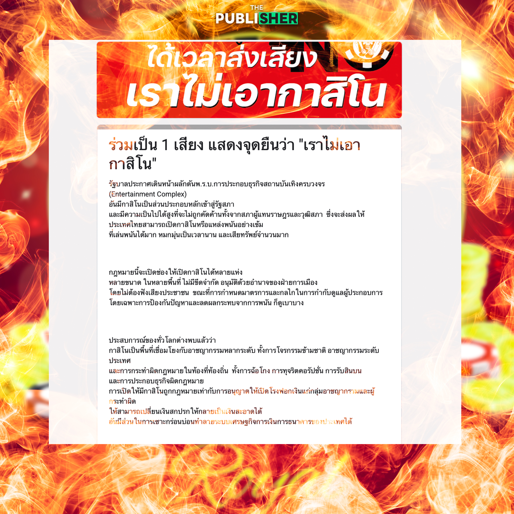 ซึ่งหากคุณไม่เห็นด้วยกับการมีกาสิโนถูกกฎหมายในประเทศไทย สามารถลงชื่อแสดงจุดยืนว่า “เราไม่เอากาสิโน” ได้ที่ https://forms.gle/PBBBYki6Lbcb4HZh9