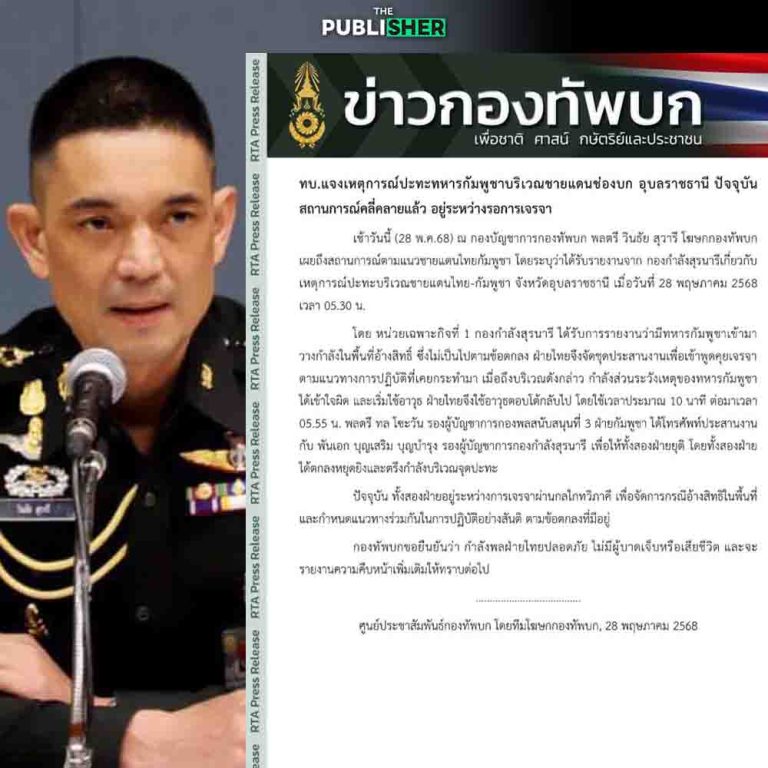 “กองทัพบกยืนยันว่า กำลังพลฝ่ายไทยปลอดภัย ไม่มีผู้บาดเจ็บหรือเสียชีวิต และจะรายงานความคืบหน้าเพิ่มเติมต่อไป” – ศูนย์ประชาสัมพันธ์กองทัพบก
