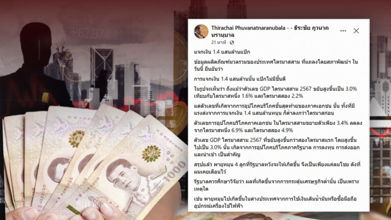 หลังสภาพัฒนาเศรษฐกิจและสังคมแห่งชาติ หรือ สภาพัฒน์ แถลงผลิตภัณฑ์มวลรวมในประเทศไทย หรือ GDP ไตรมาส 3/2567 ว่าเศรษฐกิจไทยขยายตัว 3% ดีขึ้นกว่า 2 ไตรมาสแรก หลังการบริโภคภาคเอกชน การใช้จ่ายภาคบริการ ภาคการก่อสร้าง การส่งออกขยายตัว รวมถึงรายได้การท่องเที่ยวเพิ่มขึ้นอยู่ที่ 1.5 ล้านล้านบาท ทำให้คาดทั้งปี 2567 จะขยายตัวได้ 2.6 %