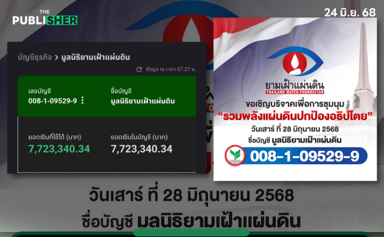 ผ่านไป 20 ชั่วโมงเวลา 7.30 น. มีผู้โอนเงินมากกว่า 5,000 รายการ จนทางแอปไม่สามารถรายงานจำนวนครั้งที่โอนได้มากกว่านี้แล้ว รวมเป็นงิน 7,723,340.34 บาท เข้าบัญชีมูลนิธิยามเฝ้าแผ่นดิน ธนาคารกสิกรไทย บัญชีกระแสรายวันเลขที่ 008-109529-9 เพื่อให้มูลนิธินำเงินไปมอบให้ “กลุ่มพลังแผ่นดินปกป้องอธิปไตย” ที่จะจัดกิกรรมชุมนุมสาธารณะเพื่อให้ความรู้และแสดงความรักชาติปกป้องอธิปไตยไทย ในวันที่ 28 มิถุนายน 2568