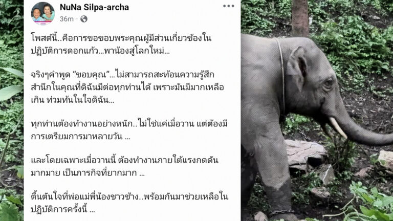โดยนางสาวกัญจนา ขอบคุณทีมแพทย์ ทีมควาญช้าง ผู้บริหารปางช้าง คุณธีรภัทร ตรังปราการ จากร่มแดนช้าง คุณแสงเดือน ชัยเลิศ ที่ช่วยดูแลดอกแก้วช่วงที่อยู่ ENP และขอบคุณพ่อพลายข้ามแดน ที่ถูกดอกแก้วเอางาน้อยๆ ทิ่มก้น แม่พังบุญดี ที่ช่วยประคองย้ายน้องดอกแก้วจนถึงบ้านใหม่