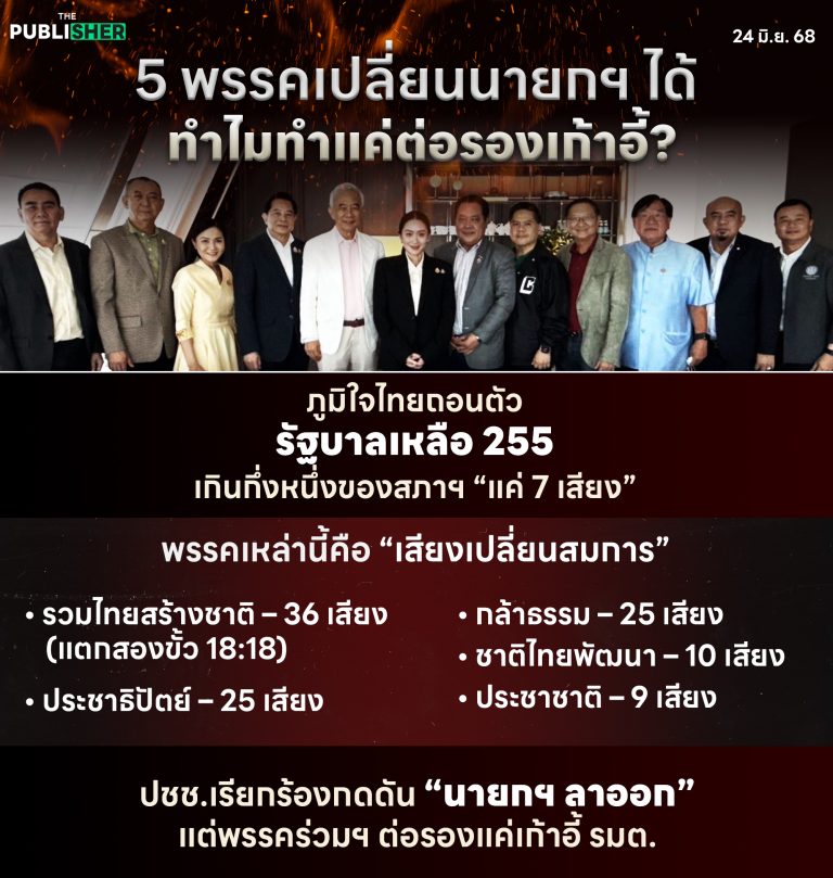 #ThePublisherTH #สำนักข่าวออนไลน์เพื่อสังคม #พรรคร่วมรัฐบาล #รัฐบาลแพทองธาร #คลิปเสียงแพทองธาร #เกมการเมือง #มันจบแล้วอุ๊งอิ๊งค์ #ถอนตัวร่วมรัฐบาล #เปลี่ยนผู้นำไม่ใช่ยุบสภา #แพทองธาร #ศาลรัฐธรรมนูญ #ฮุนเซน #คลิปเสียงร้อน #ถอดถอนนายกฯ #7เสียงเปลี่ยนสมการ