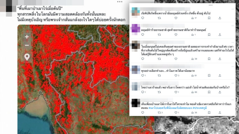ผู้ใช้ x รายหนึ่ง โพสต์ภาพแผนที่ที่แสดงถึงการเผาป่าช่วงต้นปีที่ผ่านมา ในภาพจะเห็นสีแดงเกือบเต๊มพื้นที่บริเวณภาคเหนือ พร้อมคำบรรยายว่า “พื้นที่เผาป่า เผาไร่เมื่อต้นปี ทุกสรรพสิ่งในโลกมันมีความสอดคลัองกันทั้งนั้นแหละ ไม่มีเหตุบังเอิญ หรือพระเจ้ากลั่นแกล้งอะไรใด ๆ ได้บ่อยครั้งนักดอก”