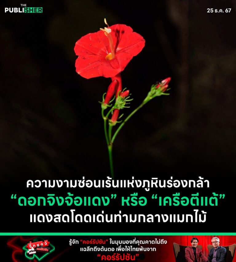 เพจ “กรมอุทยานแห่งชาติ สัตว์ป่า และพันธุ์พืช” เผยภาพความงดงามของไม้เลื้อยชนิดหนึ่งที่โดดเด่นด้วยดอกสีแดงสดใสท่ามกลางแมกไม้อุดมด้วยความอุดมสมบูรณ์ของธรรมชาติ อย่าง “จิงจ้อแดง” หรือ “เครือตีแต้” (Ipomoea𝘐𝘱𝘰𝘮𝘰𝘦𝘢 𝘩𝘦𝘥𝘦𝘳𝘪𝘧𝘰𝘭𝘪𝘢 𝘓.) สมาชิกในวงศ์ผักบุ้ง หรือ Convolvulaceae